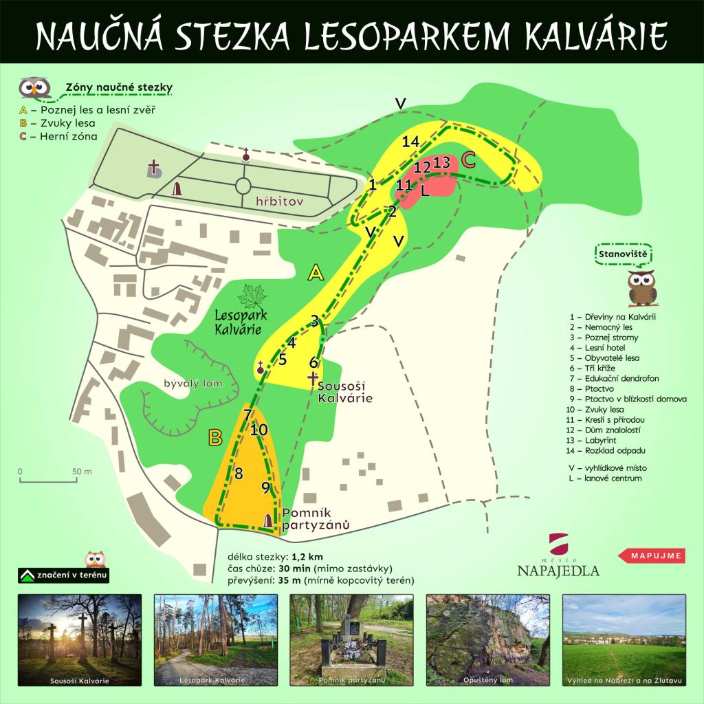 Začátkem školního roku byla dokončena dlouho očekávaná naučná stezka Lesoparkem Kalvárie. Cestou po zelenobílých šipkách si užijete zábavu s herně-edukativními prvky, můžete se zaposlouchat do zvuků zvířat (přibalte si chytrý telefon), dozvíte se také plno zajímavostí o přírodě a zrelaxovat můžete na některé z mnoha laviček. Na lesním hřišti nezapomeňte vyzkoušet lanáček.